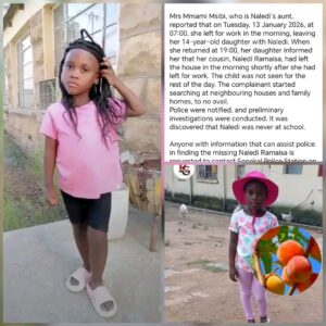 According to police reports, Naledi was last seen on the morning of 15 January when her aunt, who is also her guardian, left for work at around 07:00. When she returned home later that day, Naledi was nowhere to be found. Concerned for the child’s safety, the aunt immediately reported her missing, prompting a police search operation and community involvement.