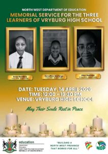 The North West Department of Education has extended heartfelt condolences to the grieving families of three learners who were recently laid to rest in an emotional memorial service held at Vryburg High School on 14 April 2026.