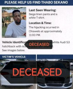 Thabo Sekano’s body was discovered near an informal settlement in Lenasia South. Authorities confirmed that he had been murdered. The incident is believed to be linked to a hijacking, though investigations are still ongoing to determine the full circumstances surrounding his death.