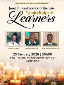 Sebokeng is draped in grief today as families, community members, learners and leaders gather at the Saul Tsotetsi Multipurpose Centre for the joint funeral service of three young learners whose lives were tragically cut short in the devastating Vanderbijlpark scholar transport accident. The atmosphere is heavy with sorrow as mourners come together to honour the memories of children who left home for school and never returned.