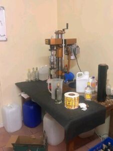 Inside the house, officers discovered equipment and materials typically used in counterfeit alcohol production. This included empty bottles, alcohol mixtures of unknown origin, funnels, large containers, and branding labels from well-known commercial liquor brands. Among the labels seized were those of Old Buck, Gordon’s, and Smirnoff — suggesting that the suspects were bottling unregulated alcohol and passing it off as recognised products.