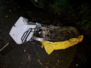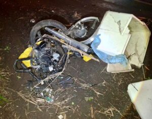 The motorcycle, identified as a Big Boy delivery bike, was left extensively damaged, with pieces of debris scattered across the road. The rider was thrown several metres from the point of impact, eventually landing on the grass verge near the roadside.